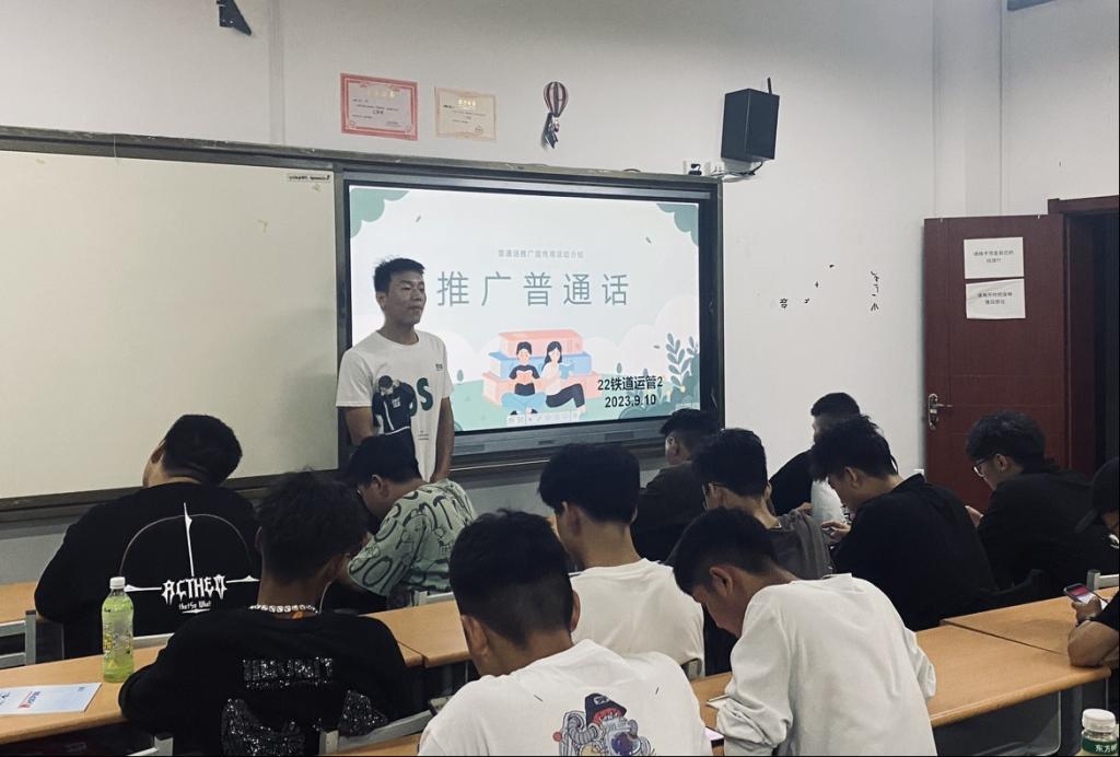 班会上,各班团支书通过图片、视频等方式,给同学们讲解了普通话的由来、什么是普通话,和同学们探讨了学习普通话的重要意义。