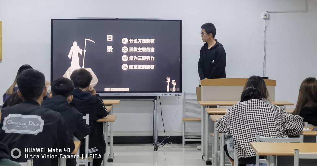 班会上,各班辅导员老师通过图片、视频等方式,给同学们讲解了邪教的本质及危害性,和同学们探讨了反邪教的重要意义。